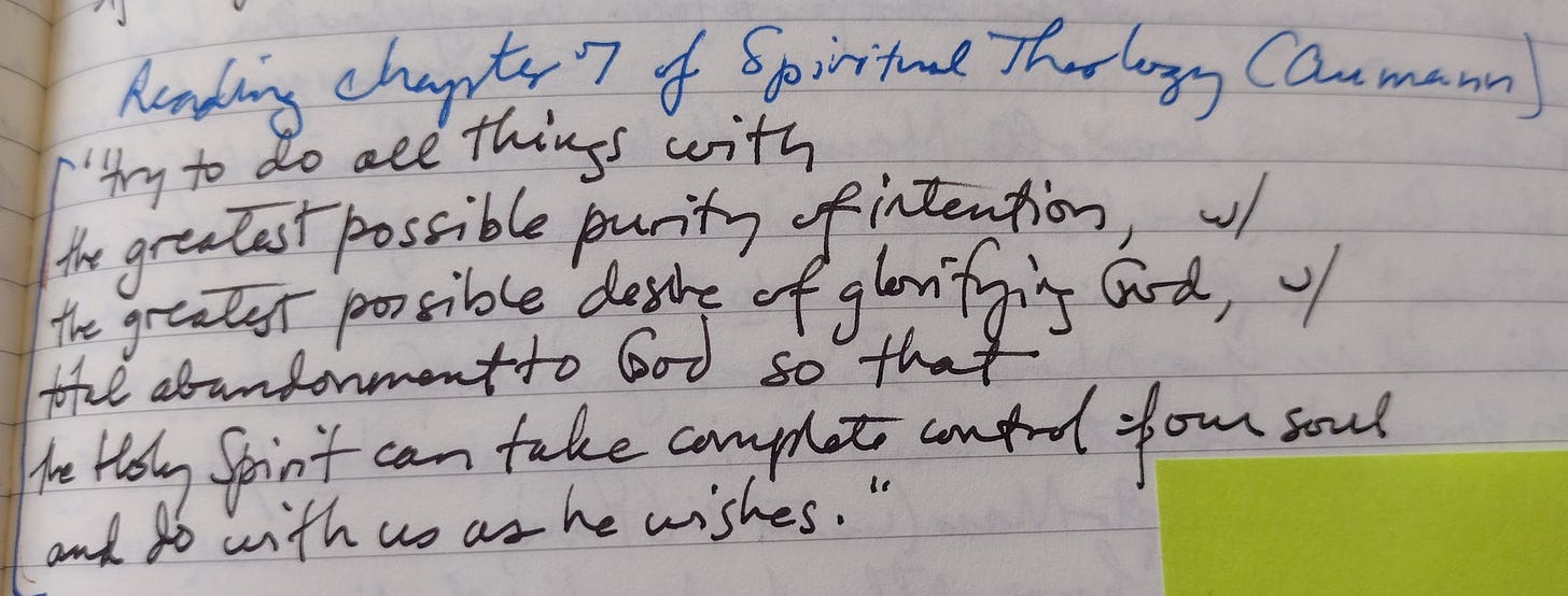 “try to do all things with the greatest purity of intention, with the greatest possible desire of glorifying God, with total abandonment to God so that the Holy Spirit can take complete control of our soul and do with us as he wishes.”